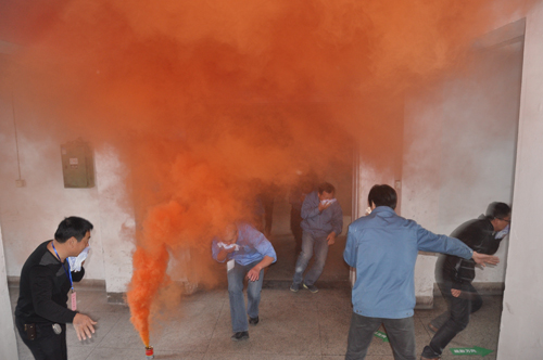 演練開(kāi)始,信號(hào)組在得到演練命令后,立即發(fā)出火警訊號(hào)。同時(shí)在各個(gè)指定點(diǎn)放啟煙霧彈,樓梯道和走廊瞬間濃煙滾滾,各演練組在聽(tīng)到逃生訊號(hào)后,在逃生組長(zhǎng)的的組織下,迅速有序地從車(chē)間里往車(chē)間外疏散,每人用濕毛巾捂住嘴巴,彎腰匍匐前進(jìn),按規(guī)定的順序出了車(chē)間后分別從中線(xiàn)(沿樓梯道)和南線(xiàn)(沿走廊)繼續(xù)疏散,最后沖出煙區(qū)。救援組的人員跟隨疏散途中搶救了一名受傷人員(專(zhuān)人份演),在煙霧中,他們抬著擔(dān)架將傷員救出,到達(dá)指定地點(diǎn)集中,最后一名員工到達(dá)指定集合地點(diǎn)的時(shí)間是1分17秒。
