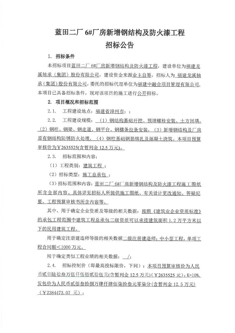 龍軸集團藍田二廠6#廠房新增鋼結(jié)構(gòu)及防火漆工程招標公告公示