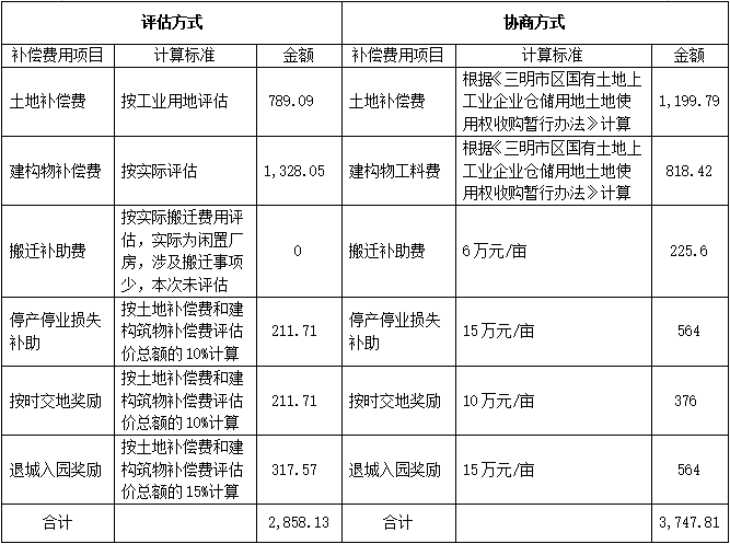 福建省三明齒輪箱有限責任公司陳大鎮廠區工業用地征遷補償方式對比表