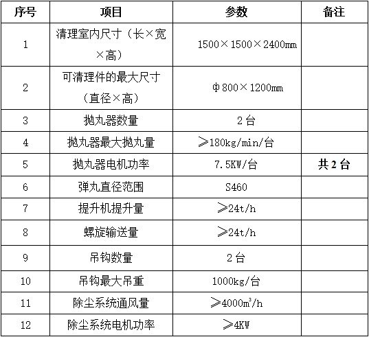 2.2功能、結構須滿足如下要求:該設備主要由吊鉤輸送系統、清理室體、拋丸器、提升機、維修平臺、分離器、螺旋輸送器、底部料斗、除塵系統、電控系統等組成。