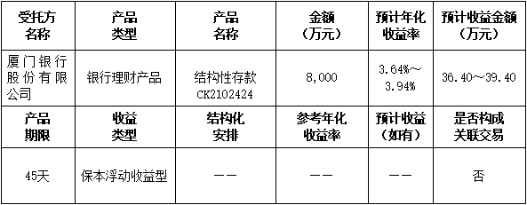?本次委托理財金額:委托廈門銀行理財8,000萬元。