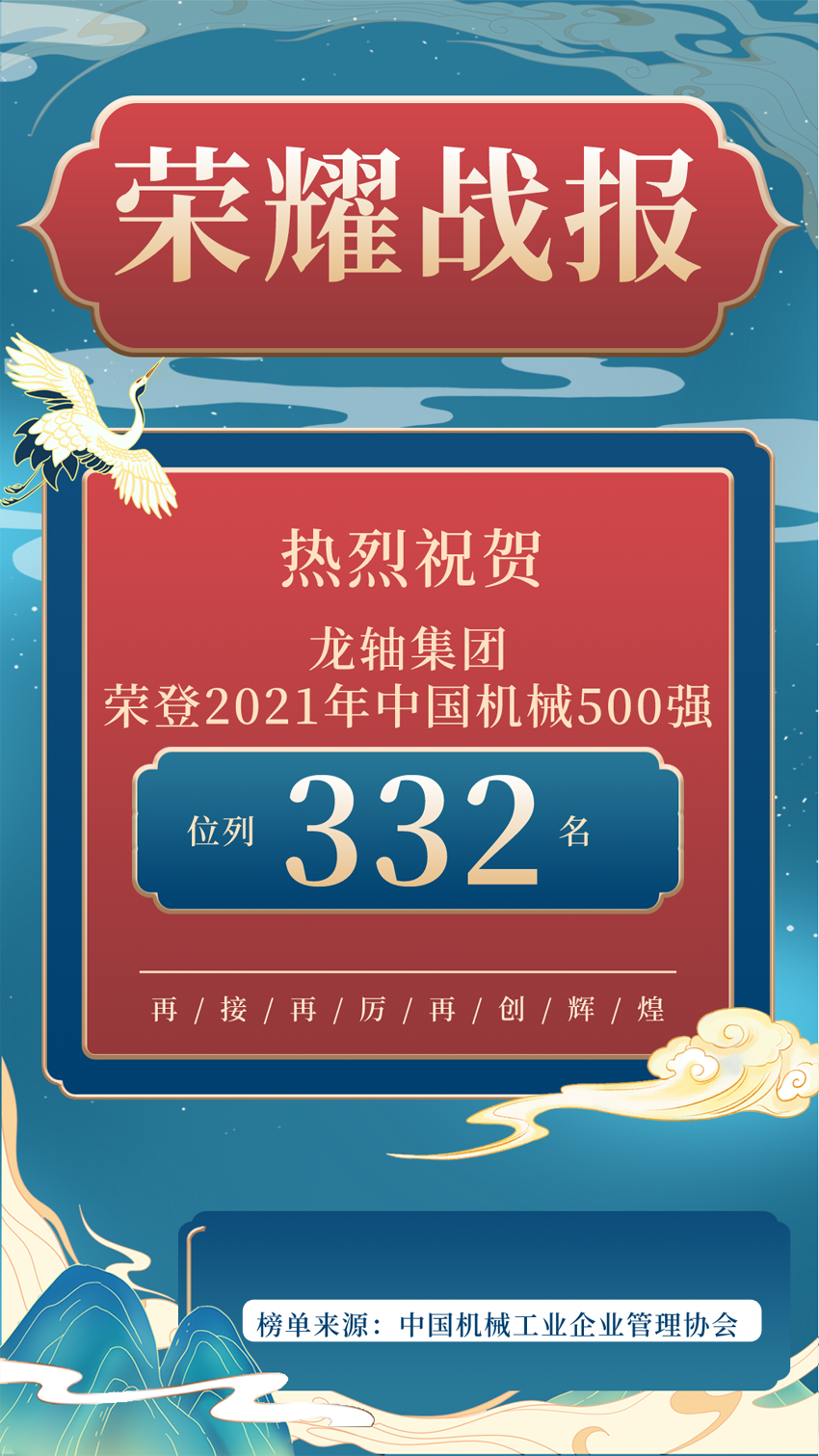12月20日,由中國機械工業企業管理協會和機械工業信息研究院共同主辦的2021年(第十九屆)中國機械500強研究報告發布會在北京舉行,發布會上隆重發布了中國機械500強榜單,龍軸集團創歷史新高,榮列332位。