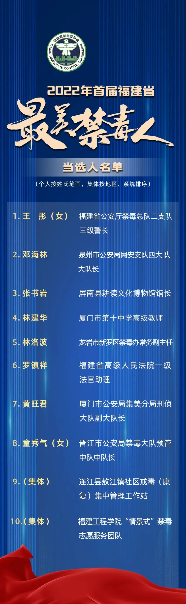 按照《關于組織開展全省首屆“最美禁毒人”宣傳推選活動的通知》要求,經基層推薦、組織初審、網絡投票、專家評審等程序,中共福建省委宣傳部、福建省禁毒委員會辦公室確定了2022年首屆福建省“最美禁毒人”10名當選人、10名提名獎獲得者最終獲評名單?,F將名單予以公示,接受監督。如有異議,請在公示期限內,通過來信、來電等方式,實名反映情況。