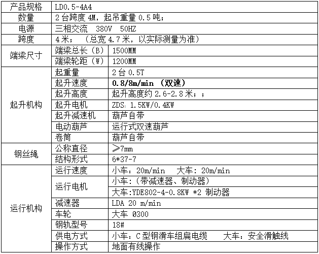 0.5噸單梁橋式起重機(jī),需根據(jù)我司現(xiàn)場(chǎng)條件,全新安裝立柱、導(dǎo)軌、橫梁等,配置兩臺(tái)全新單梁橋式起重機(jī)。