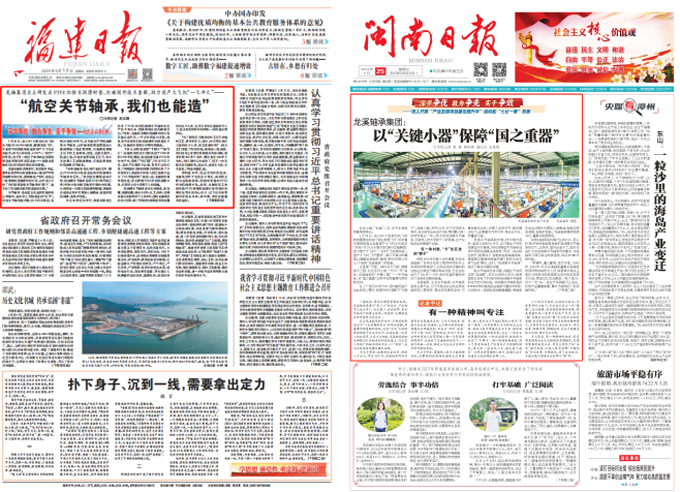 公司以國家安全為己任,自主研發全球領先的“三大核心技術”,突破國外技術和產品封鎖,助力實現我國“大飛機夢”。2023年6月14日《龍軸集團自主研發出PTFE織物自潤滑襯墊,打破國外技術壟斷,助力國產大飛機“一飛沖天”——“航空關節軸承,我們也能造”》榮登《福建日報》頭版頭條,并獲新華網推介;6月25日《閩南日報》頭版頭條專題報道《龍溪軸承集團:以“關鍵小器”保障“國之重器”》;獲評漳州市“突出工業、突破工業”十件大事。