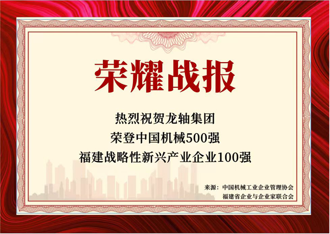 公司以雄厚的規模力、出色的效率力、強大的成長力和豐富的資源力再度獲評中國機械500強、福建戰略性新興產業企業100強,已連續16年上榜中國機械500強,連續4年上榜福建戰略性新興產業企業100強。