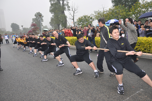 開幕儀式結束后,拔河比賽率先擂起了戰鼓,雖遇雨天,天寒路滑,運動員們依舊斗志昂揚,整齊的號子伴著現場觀眾激情的加油聲,現場一派熱火朝天。公司撥河隊健兒們卯足了勁兒比拼,惜敗于片仔癀代表隊。該項比賽最終由交通發展集團代表隊奪得冠軍。