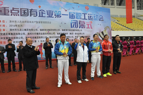 隨著接力賽的結束,漳州市市屬重點國有企業第一屆職工運動會全部比賽項目圓滿完成,頒獎儀式及閉幕式隨后舉行。漳州市市委常委、漳州市政府常務副市長梁偉新、漳州市國資委主任黃建平、漳州市國資委書記魏小芬、漳州市國資委紀委書記柯坤海分別為各個項目獲獎運動隊代表頒發獎杯。