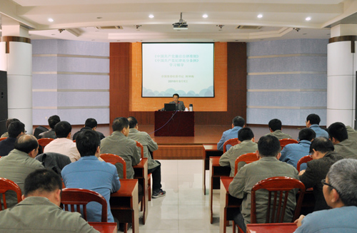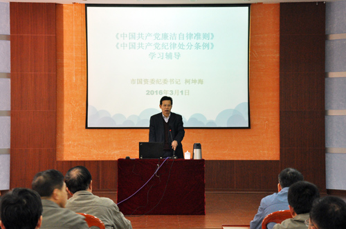 柯坤海從兩部法規修訂的背景和特點、新法規的主要內容及如何貫徹執行新法規三個方面對《準則》、《條例》進行深入淺出的詳細解讀,并聯系黨員干部工作實際進行警示教育,使參加學習的黨員干部對《準則》、《條例》有了更深刻的了解,進一步強化了黨員的身份意識及廉潔自律、忠實履職意識。