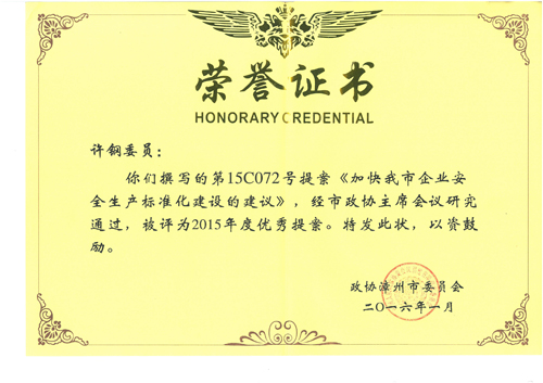 2016年1月18日上午,漳州市政協十二屆五次會議舉行開幕式,會上對2015年度優秀提案進行表彰。漳州市政協委員、公司高級工程師許鋼提交的《加快我市企業安全標準化建設的建議》被評為“2015年度優秀提案”。